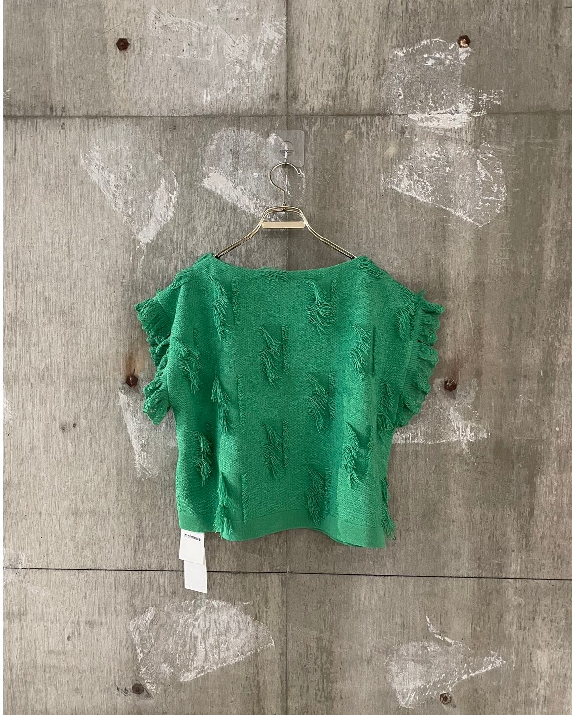 ドライタッチで通気性の良い和紙の糸を使用したカットジャガードニット。袖のレース編みがエレガントなクルーネックのショート編みがエレガントなクルーネックのショート丈プルーオーバーです。