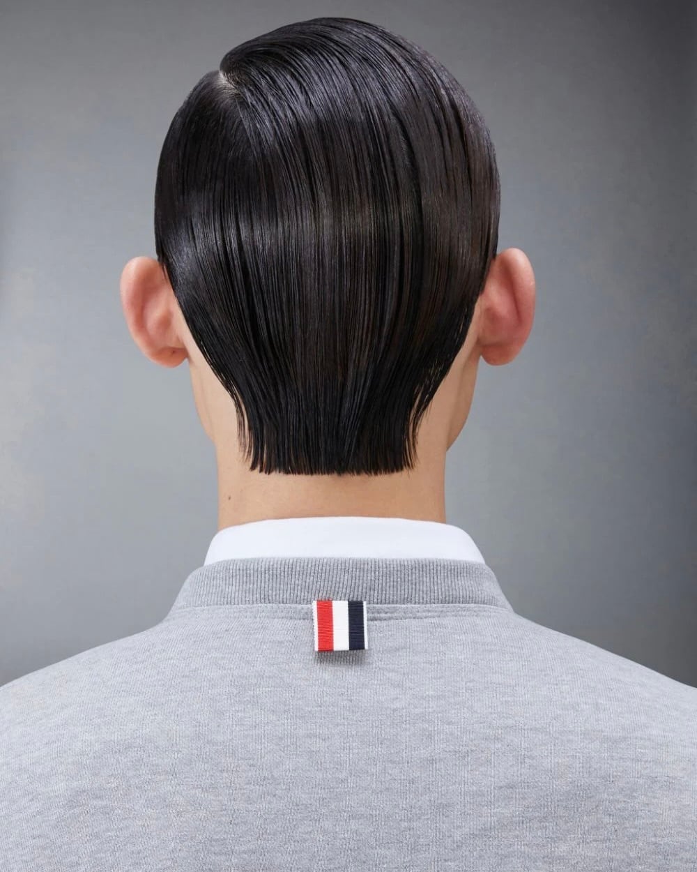 ライトグレーのループバックジャージーニットを使用したクルーネックのスウェットシャツ。左袖にはホワイトの4BARストライプがあしらわれています。リブ編みのサイドパネル、袖口、裾。裾上にネームタグのアップリケ。ボタン留めの両サイドのベントと袖口にはシグネチャーストライプのグログランがトリミングされています。背面の首元にシグネチャーストライプのグログランループタブ付き。