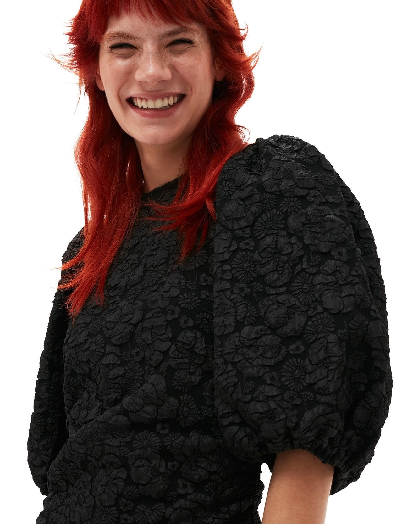 【STRETCH JACQUARD PUFF SLEEVES MINI DRESS】