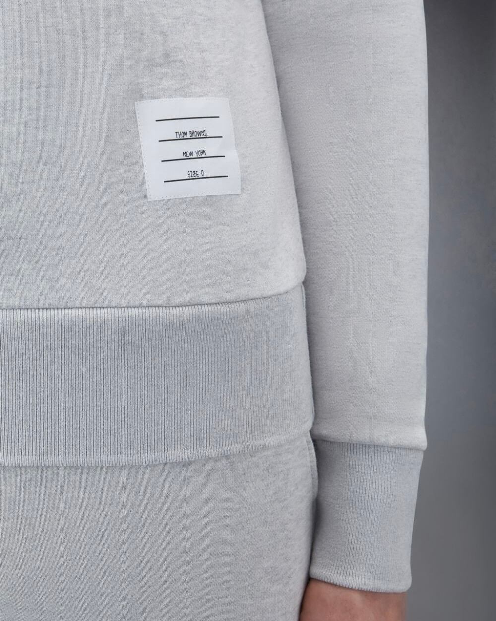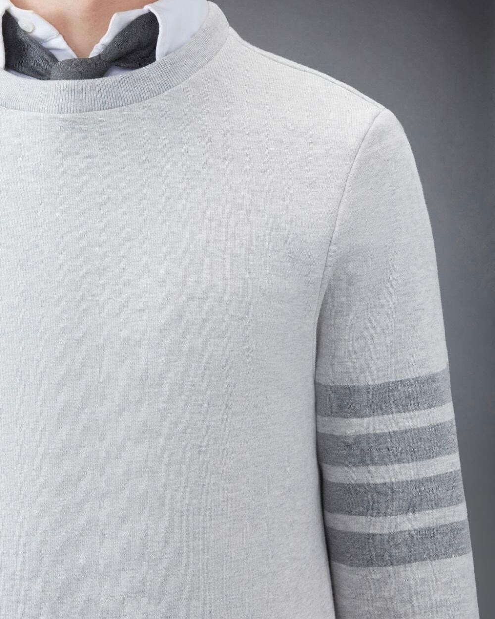 グレーのテリー織りのコットンループバックを使用した、リラックスフィットのクルーネックスウェットシャツ。左袖に同系色の4BARストライプがあしらわれています。裾にネームタグ。リブ編みの首元と袖口と裾。背中の首元にシグネチャーストライプのグログランループタブ付き。