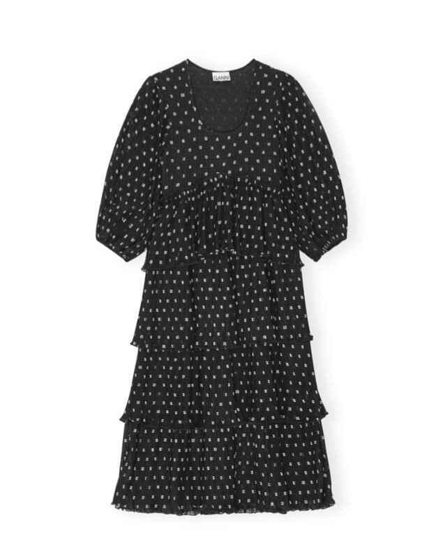 【BLACK PLEATED GEORGETTE FLOUNCE SMOCK MIDI DRESS】