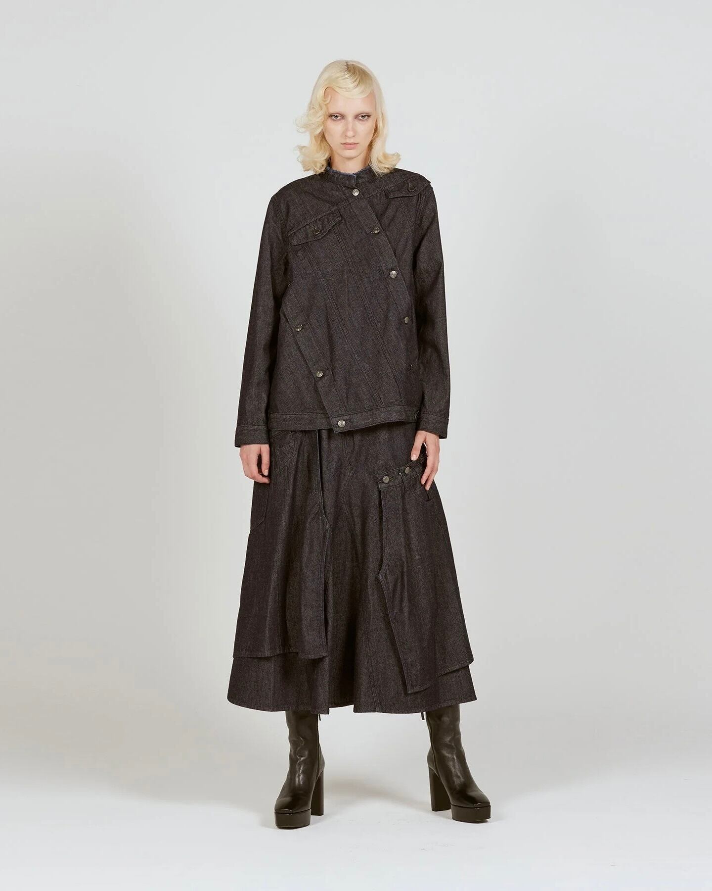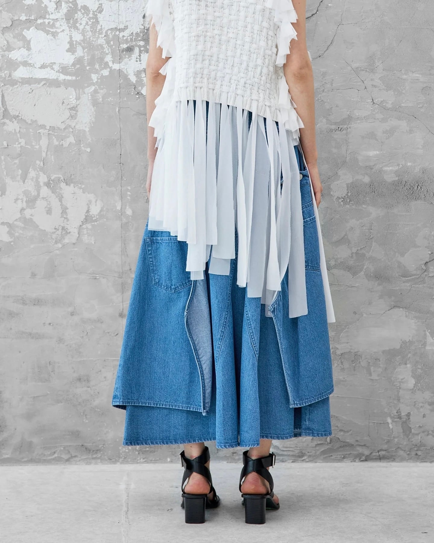 シーズンコンセプトでもある inframince(アンフラマンス:ズレ、そらし、極小的差異の意)の概念からインスパイアされたデザインのスデニムカートです。Aラインのデニムスカートにパーツを重ね合わせて、再構築したデザイン。一般的なデニムよりも軽い生地(8オンス)を使用しているため、レイヤードでも比較的重くなく、動きも軽やかです。ポケットは全部使えます。レイヤードしたパーツは取り外しができ、他のアイテムとの重ね着も楽しめるアイテムです。