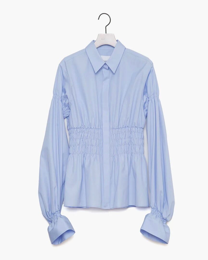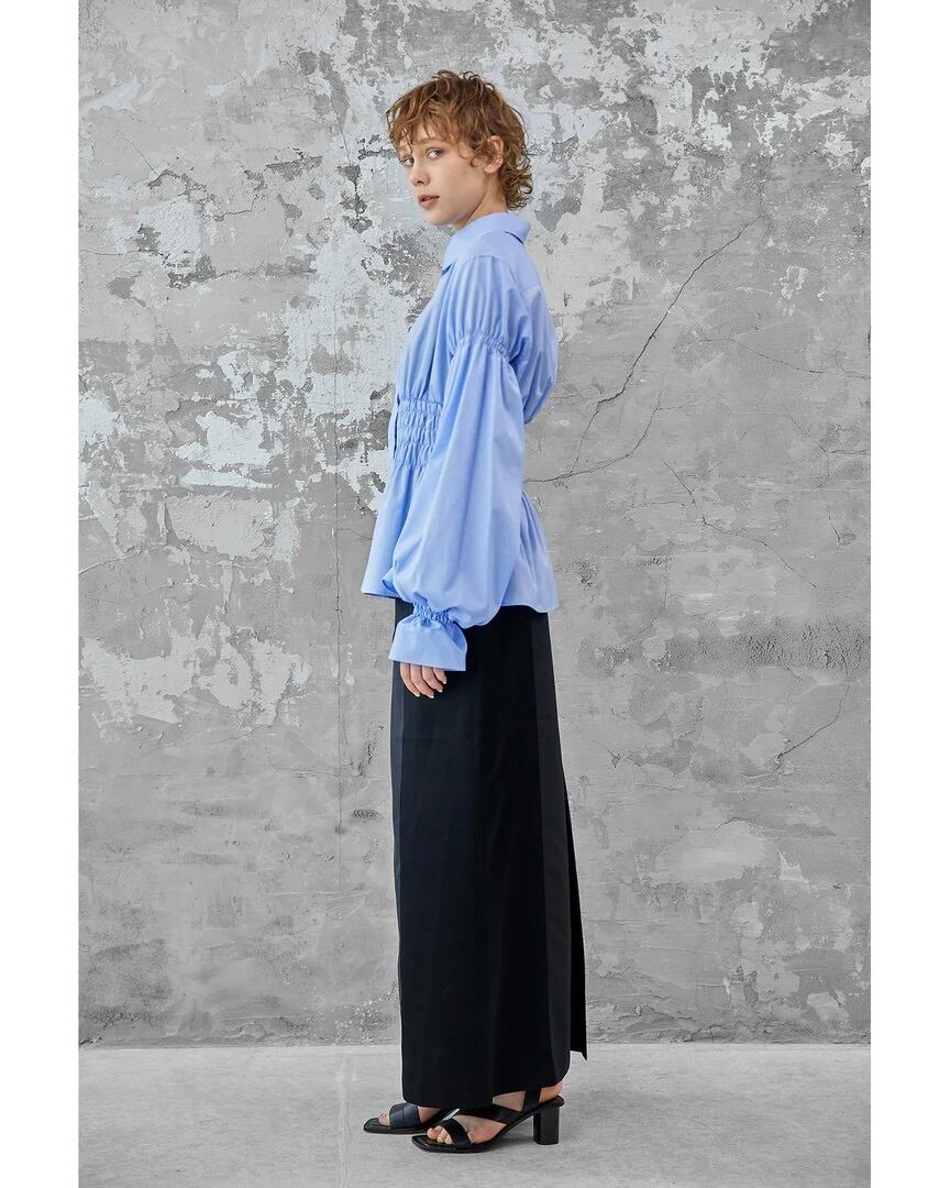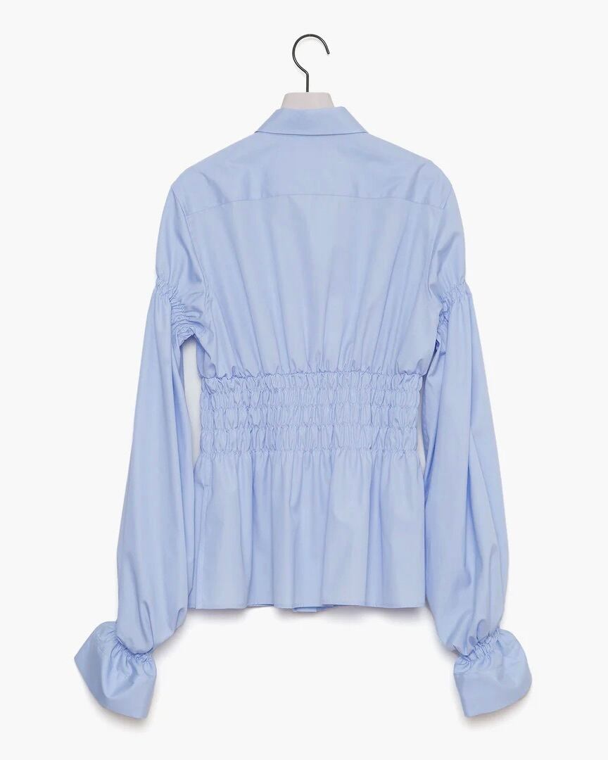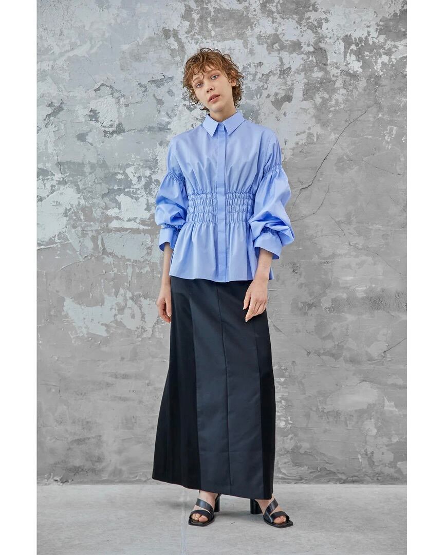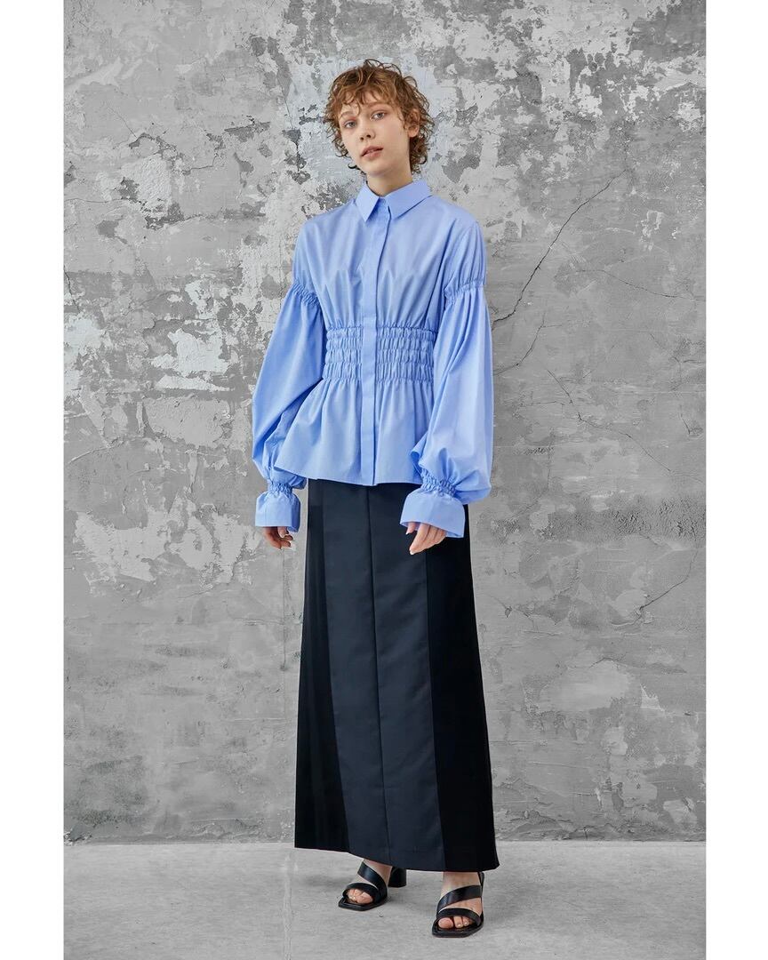 コルセットからインスパイアされたウエストのシャーリングが特徴的なコットンブロードシャツです。身頃のフィット感とボリュームスリーブのコントラストがエレガントな印象を与えます。袖口にゴムを入れているためお好みの位置で留めることができ、袖丈とボリュームの調節がききます。