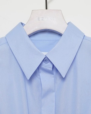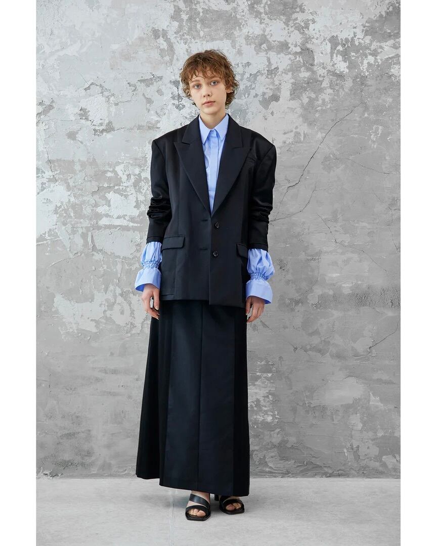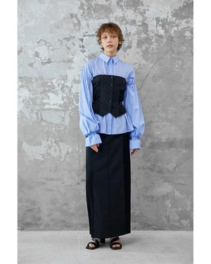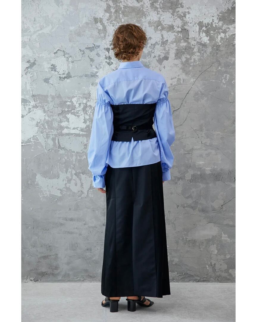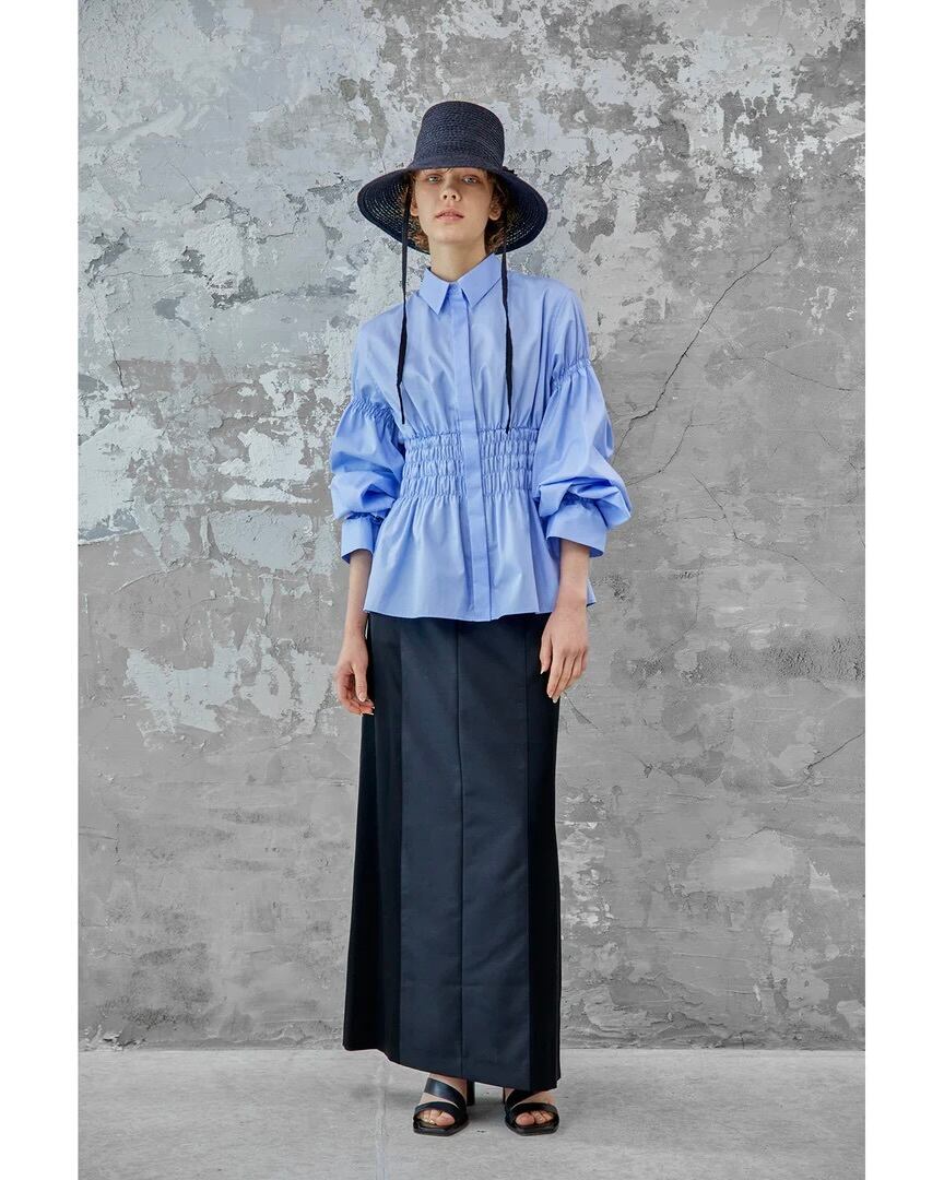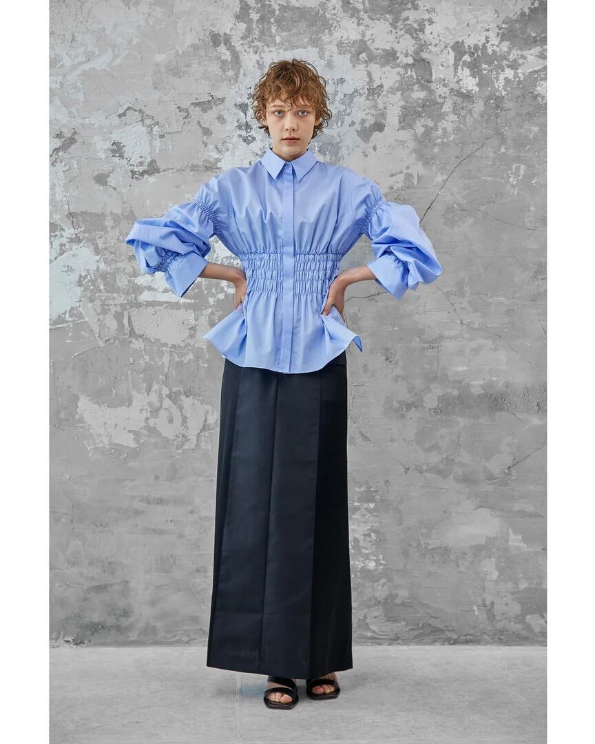 コルセットからインスパイアされたウエストのシャーリングが特徴的なコットンブロードシャツです。身頃のフィット感とボリュームスリーブのコントラストがエレガントな印象を与えます。袖口にゴムを入れているためお好みの位置で留めることができ、袖丈とボリュームの調節がききます。