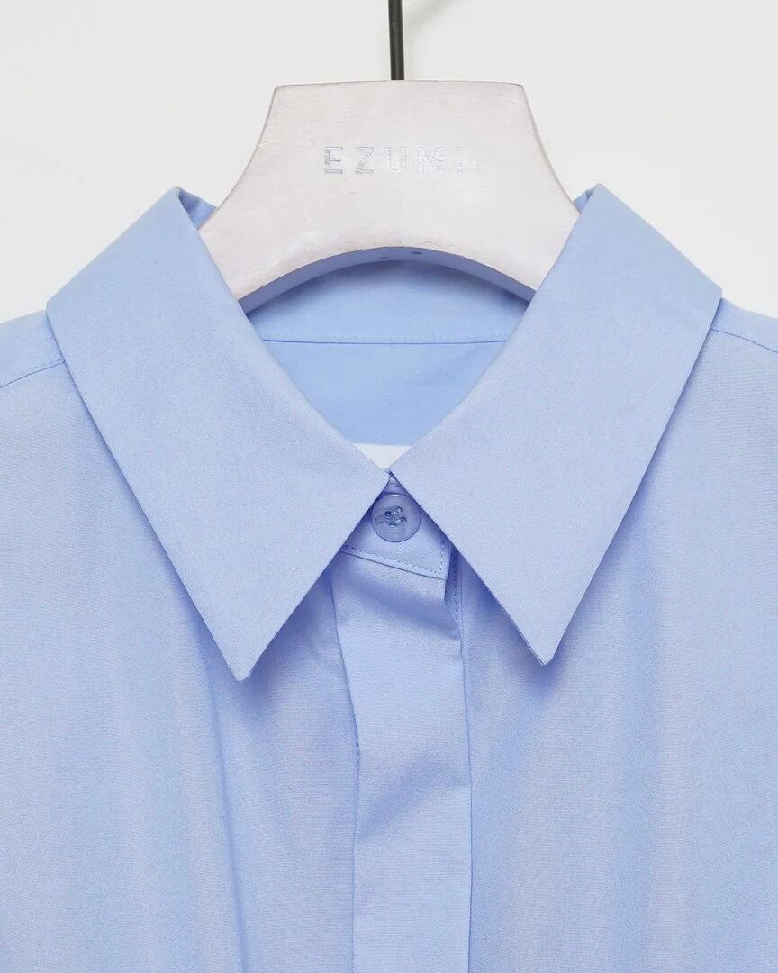 毛羽立ちを抑えた糸で上質な風合いを感じられる綿ブロードを使用していて、薄手ながらもほどよいハリがある生地です。洗いざらしでも品のよいシワ感とツヤがあります。