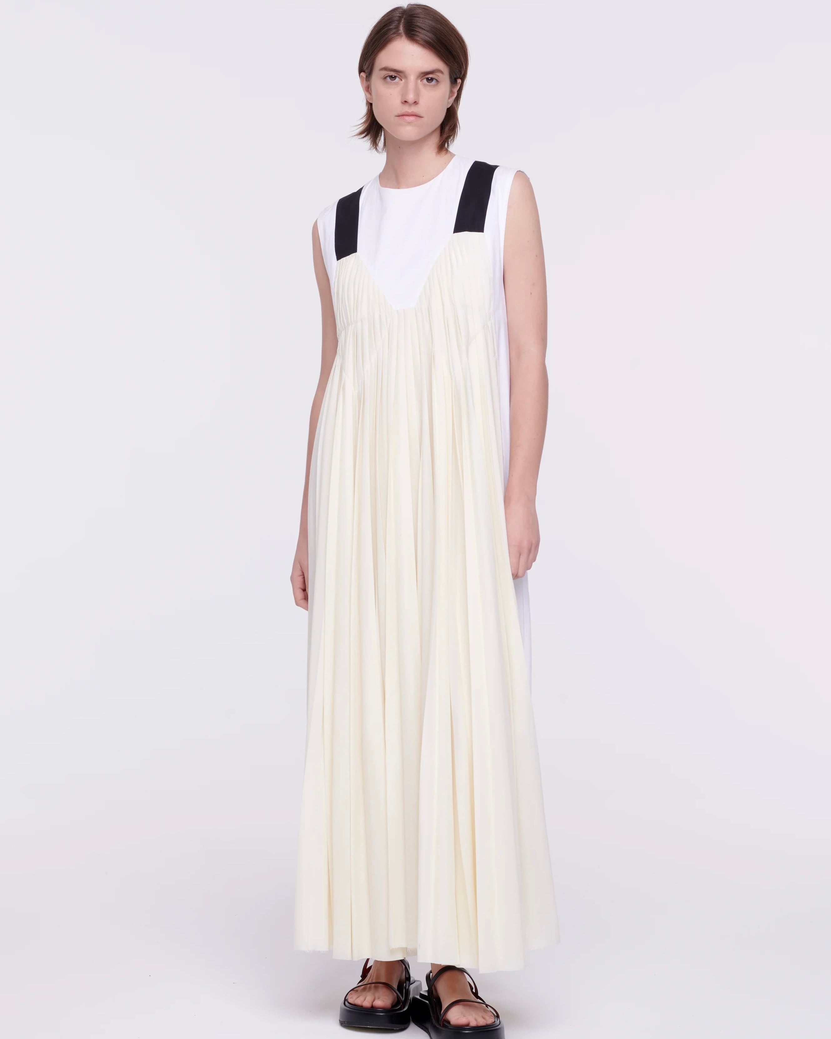 プリーツデザインのマキシドレス。Aラインのフェミニンなディテールと対照的なブラックカラーのストラップがポイント