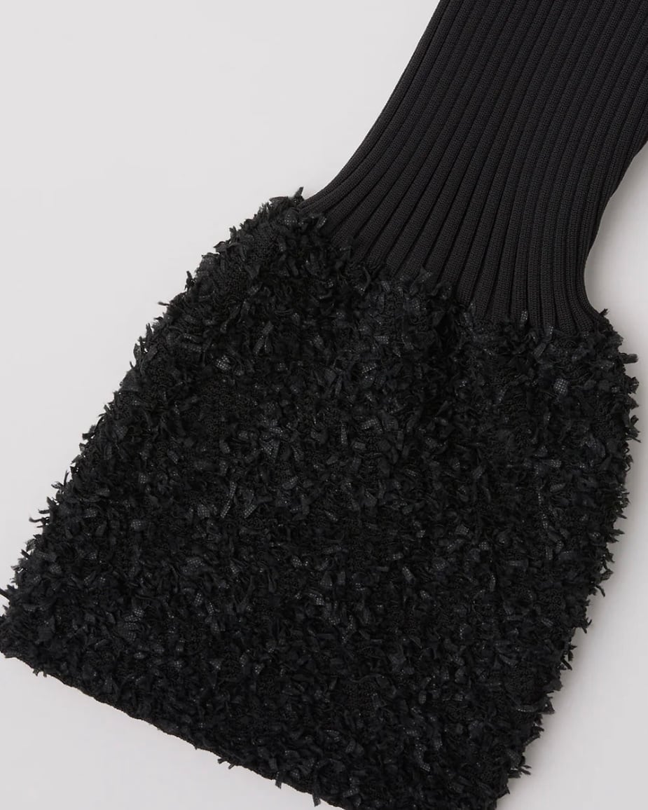 CFCLを象徴するFLUTEDシリーズのダブルジップショートジャケットです。ストレッチ性の違う2種類のリブを交互に編む事でユニークなシルエットを生み出します。一枚羽織るだけで、シャープでモードな雰囲気を気軽にコーディネートに取り入れることが出来ます。袖先には、ナイロン不織布を細かくカットし、芯糸で挟み込んで作ったモールヤーンを使用しています。程よい張り感があり、動くたびに様々な表情を見せます。