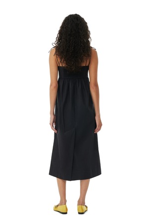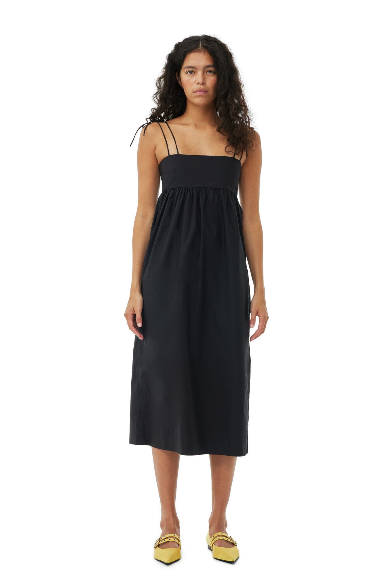 【BLACK COTTON POPLIN STRING MIDI DRESS】