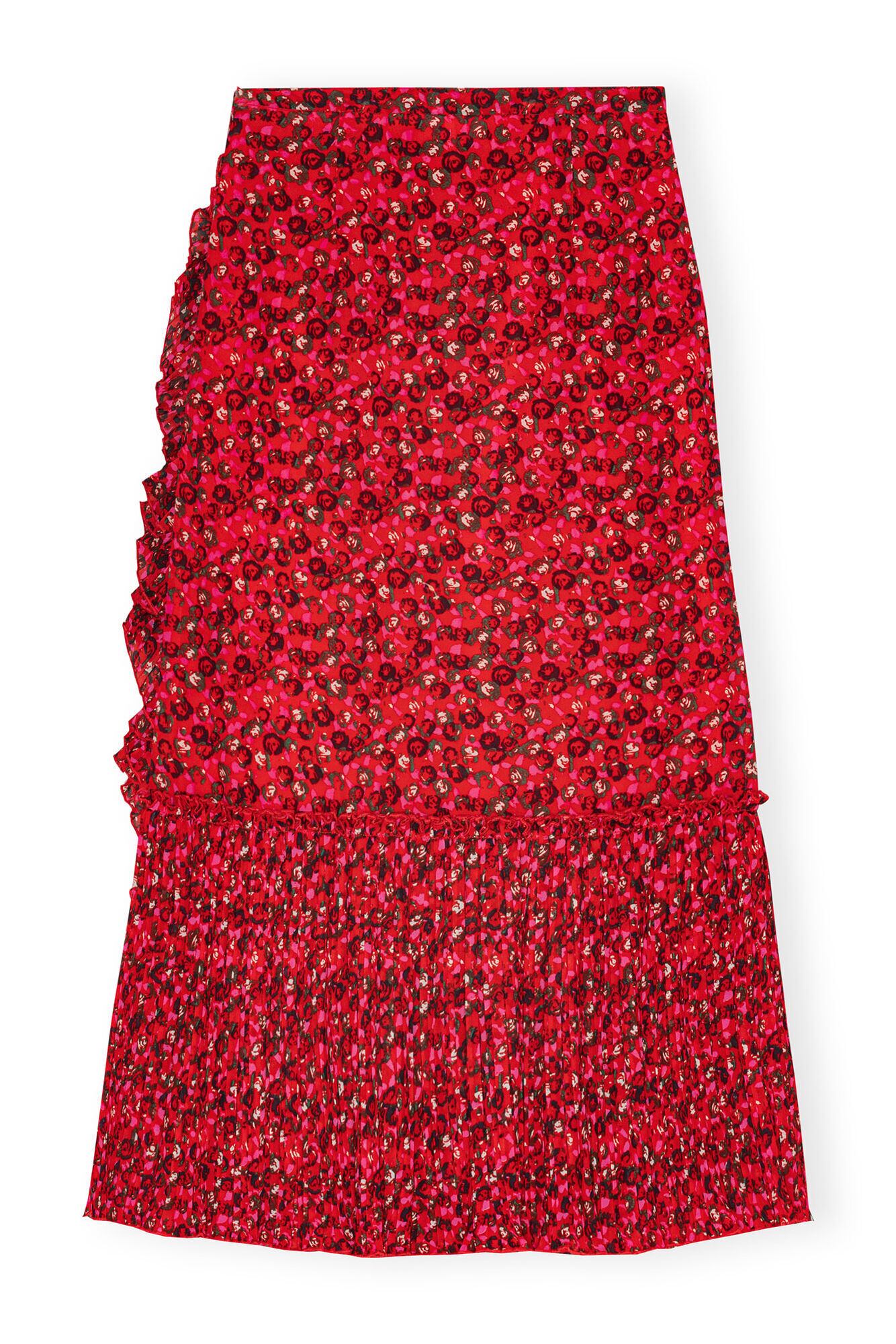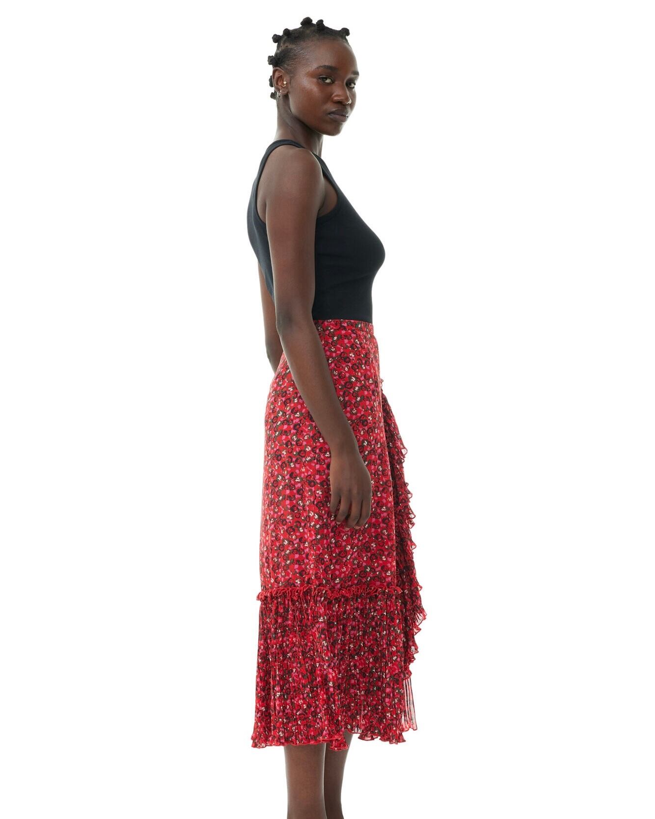 【RED PLEATED GEORGETTE FLOUNCE MIDI SKIRT】