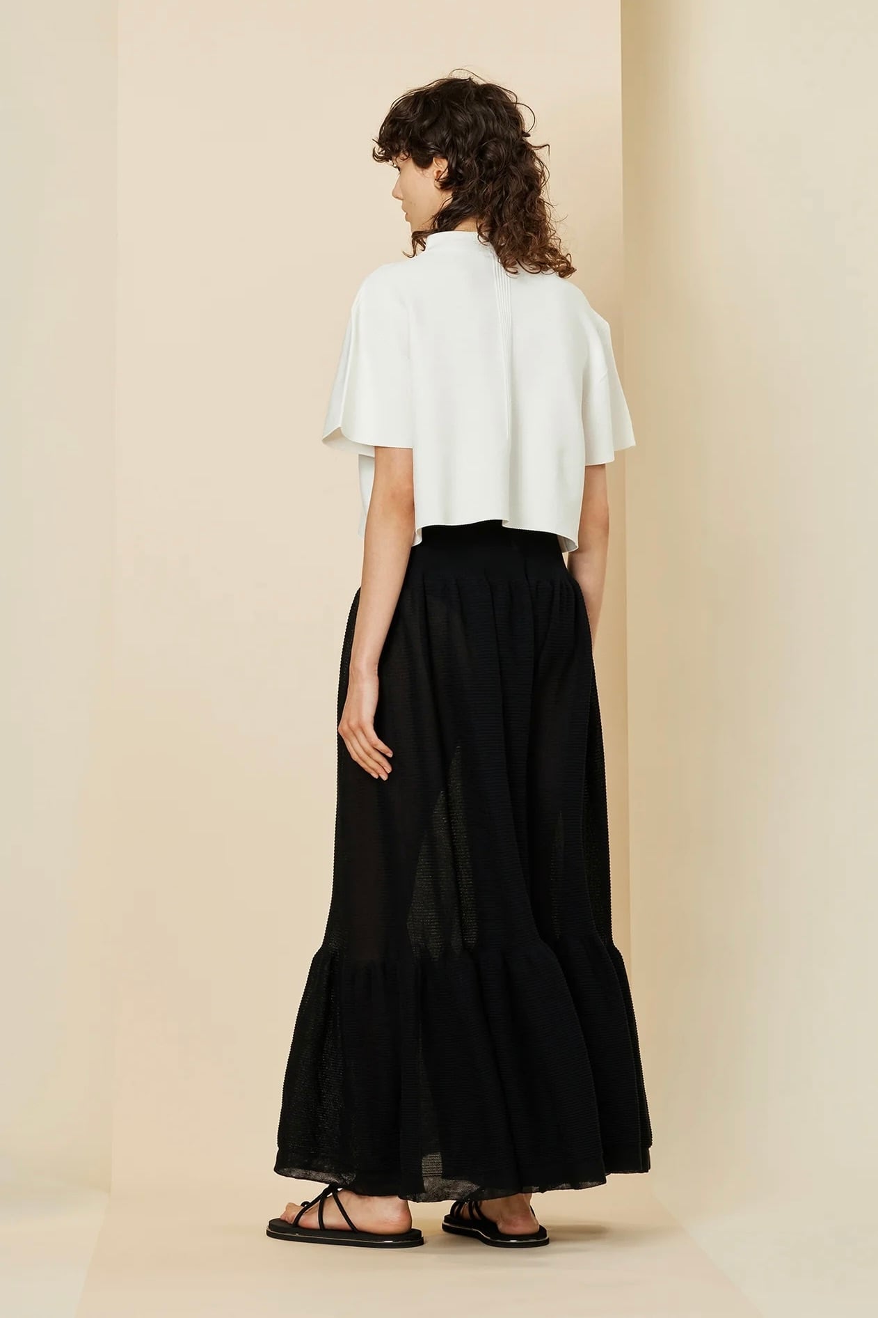 タイトフィットなショートスリーブトップスです。無縫製でストレッチ性に優れ、キュプラとポリエステルによるリブが、程よい張り感をつくります。クロップトップのデザインがモード感を演出します。