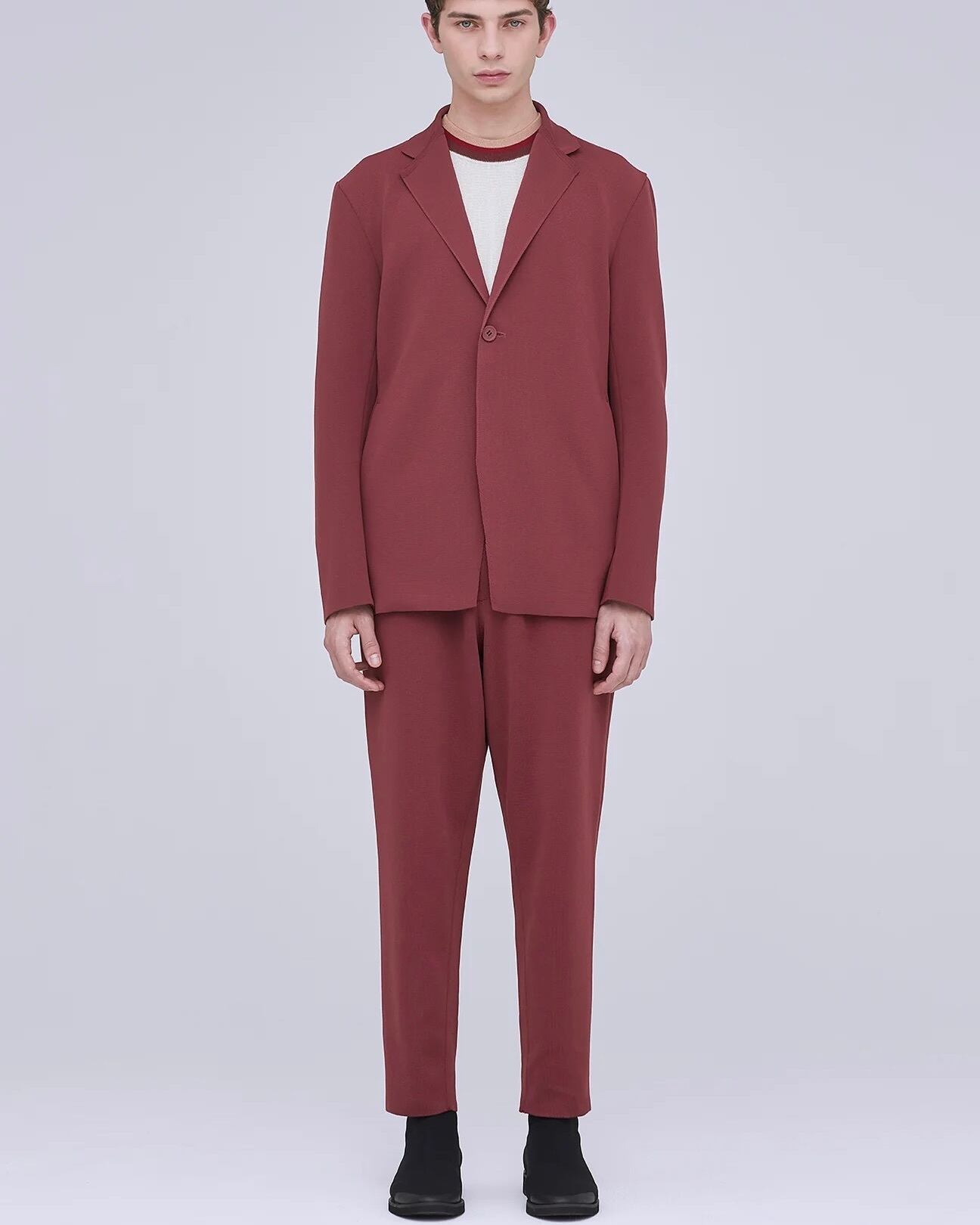 ヒップ周りにはたっぷりとしたゆとりを持たせ、裾に向けて極端にテーパードをかけることでリラックスと快活なイメージを両立しています。