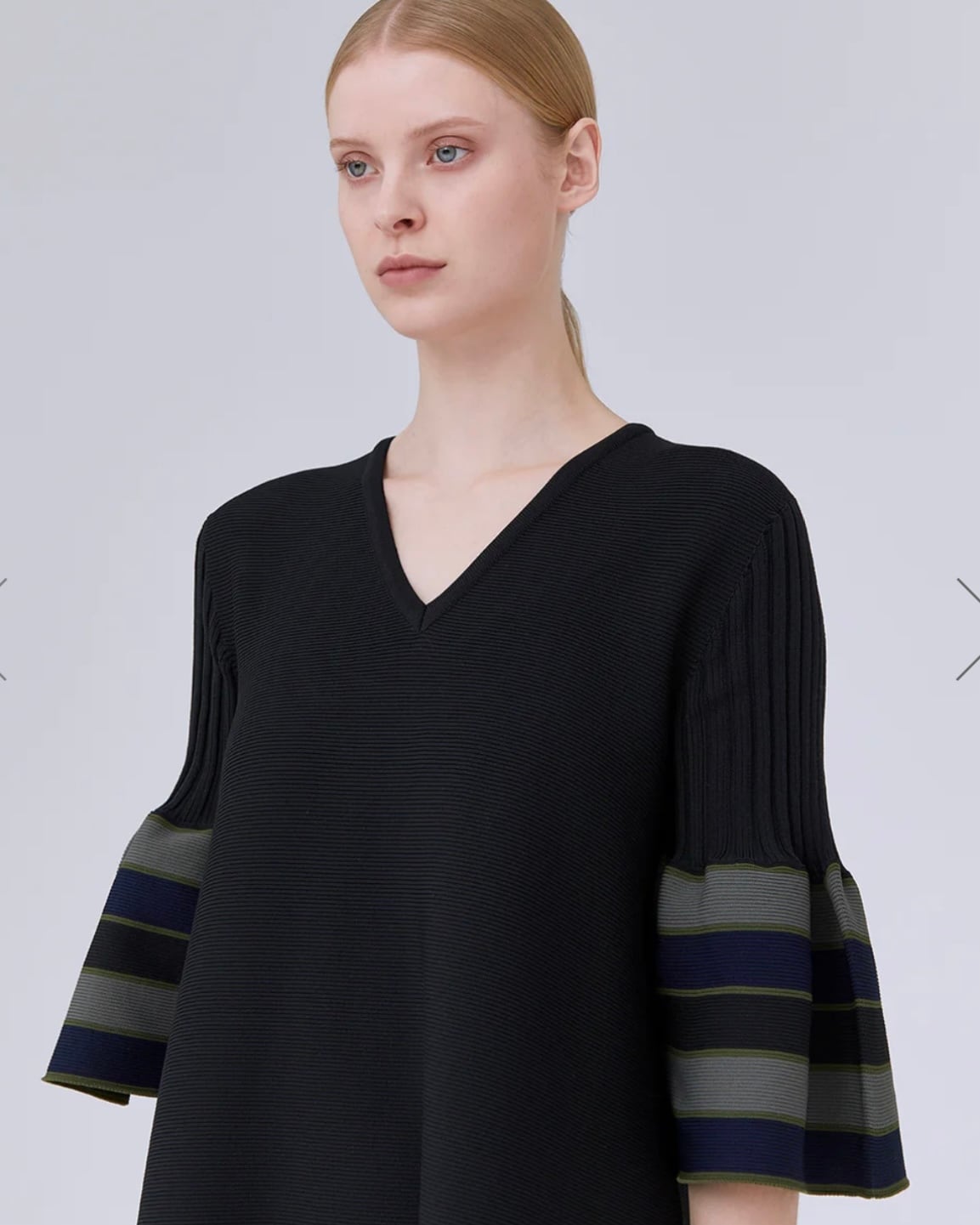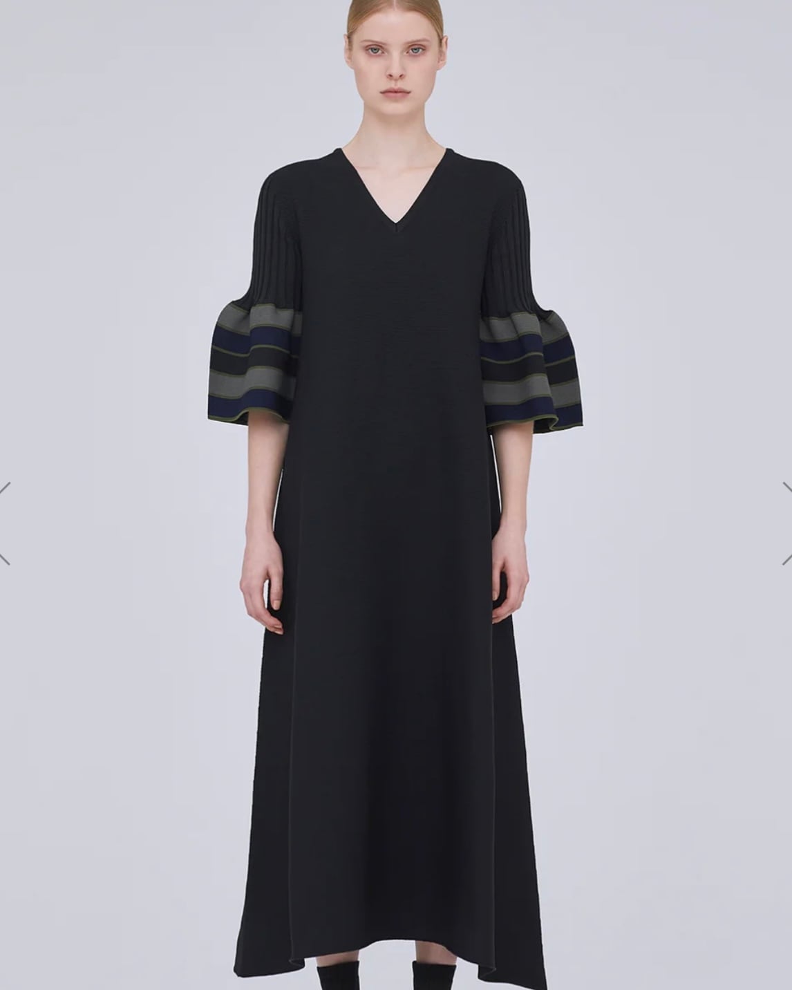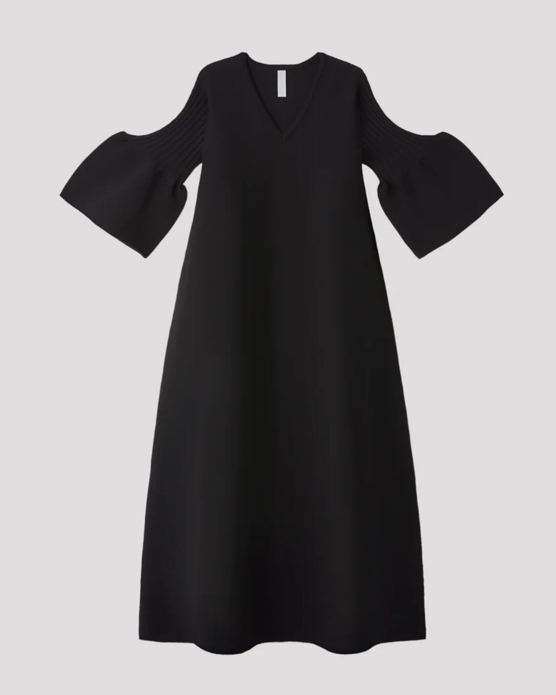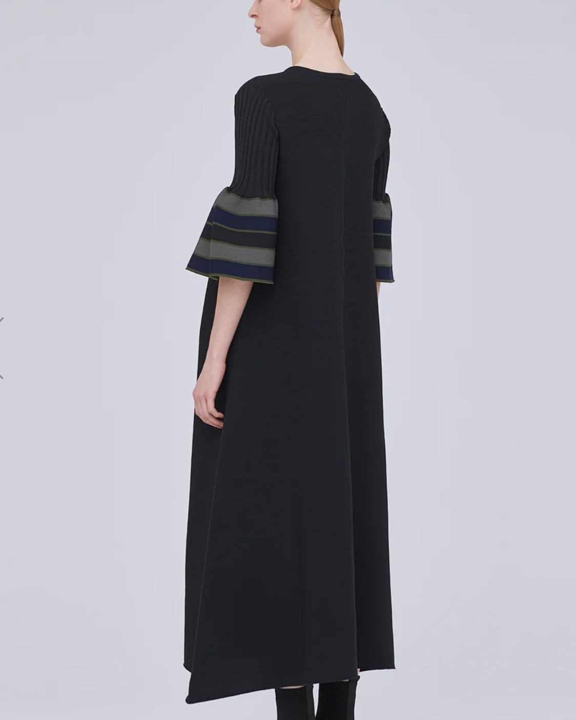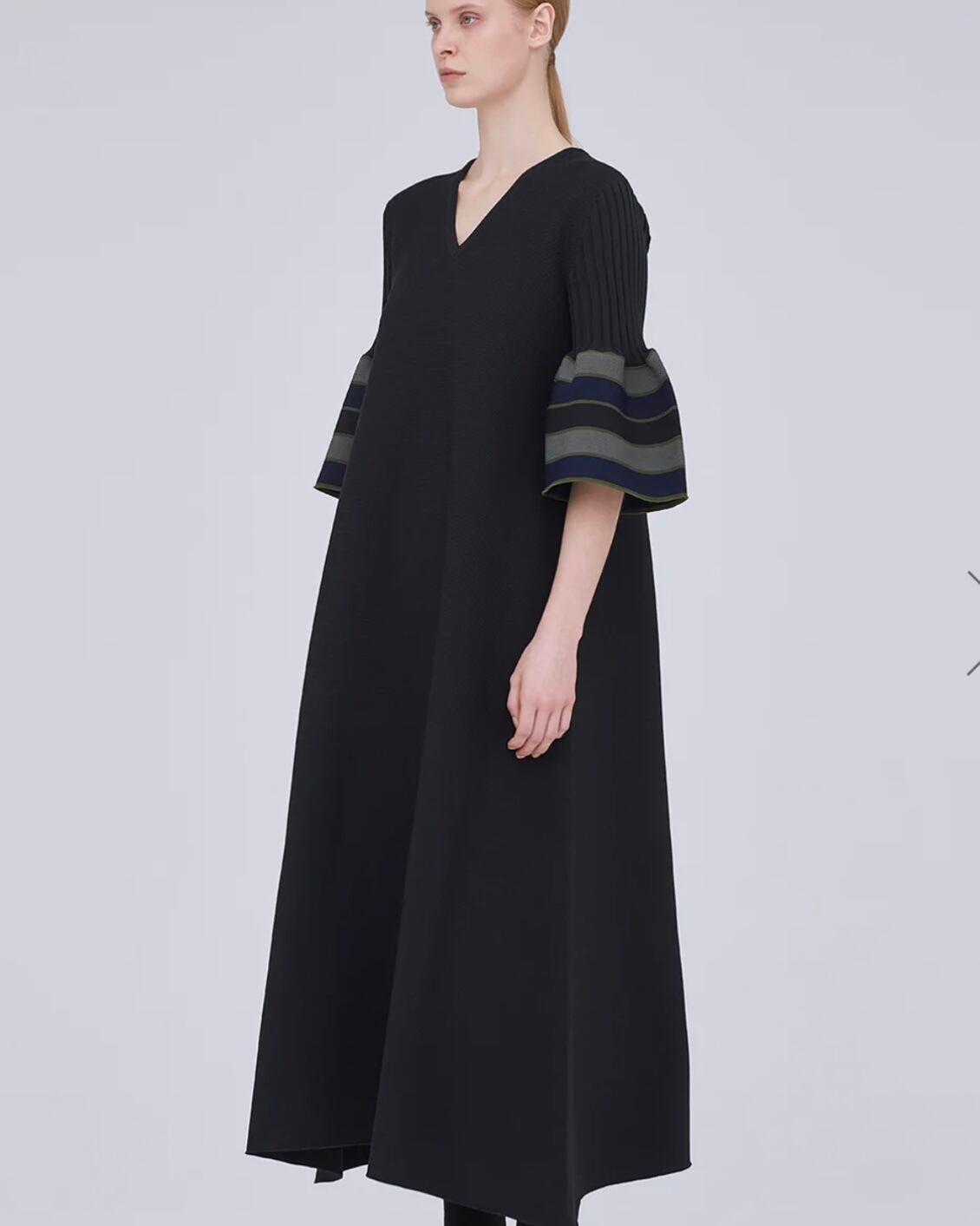 CFCLを象徴するPOTTERYシリーズのベルスリーブフレアドレス。 コンピュータープログラミングによって作られた、立体感のあるベルスリーブや洗練とされた印象のVネックは、あらゆるオケージョンに対応できるデザインです。ボディラインを拾わないフレアのシルエットで、縫代がないため、着心地よく快適にご着用頂けます。