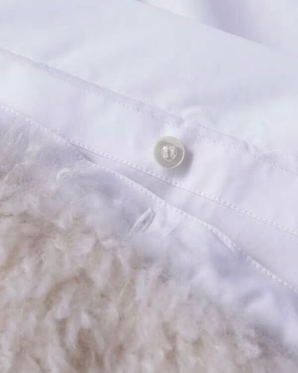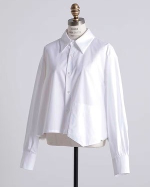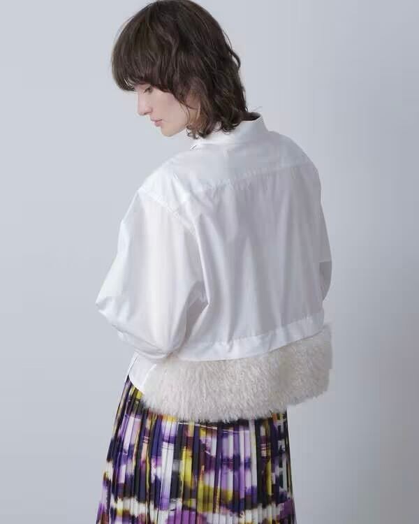 ベースは一見シンプルなクロップド丈のシャツですが、身頃からはみ出したアンバランスなポケット位置の設定と後身頃裾部分に脱着可能なエコシープファー素材のパーツをセットすることで前後ともに印象的な表情のシャツアイテムです。