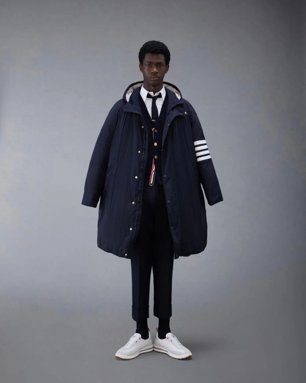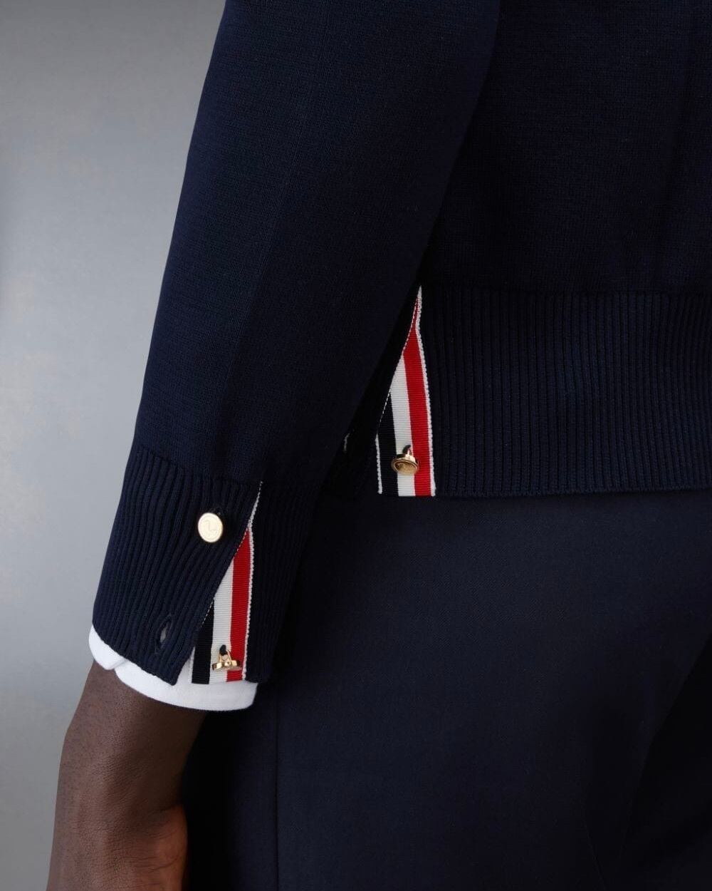ボタン留めの両サイドのスリットと袖口に、シグネチャーストライプのグログランのトリミング