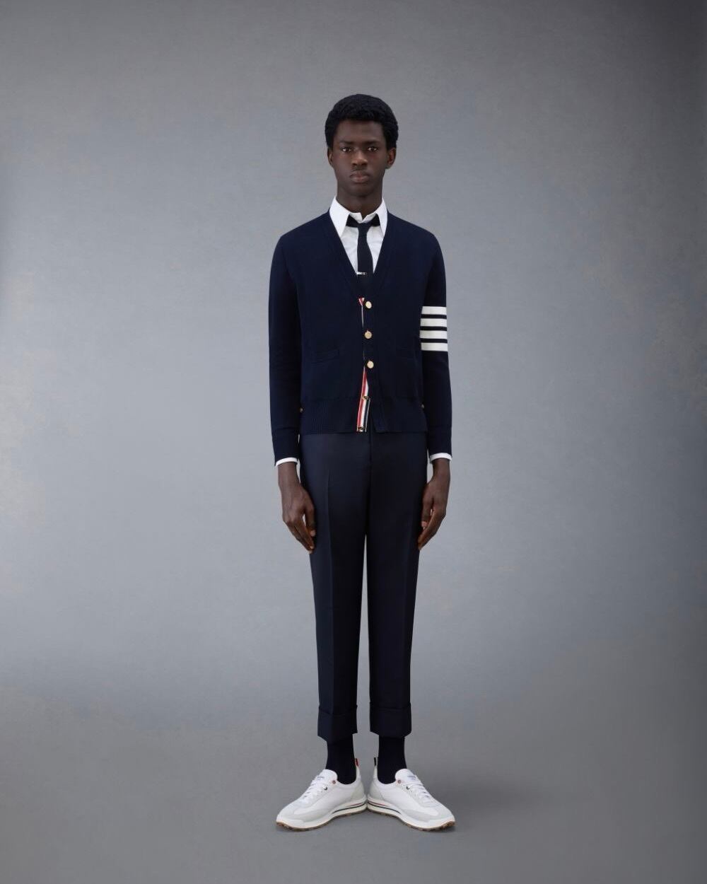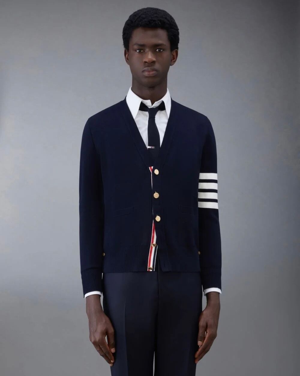 トム ブラウンのブランドアイコンであるグログラントリムと4BARストライプがあしらわれたコットンクレープ生地のVネックカーディガンです。