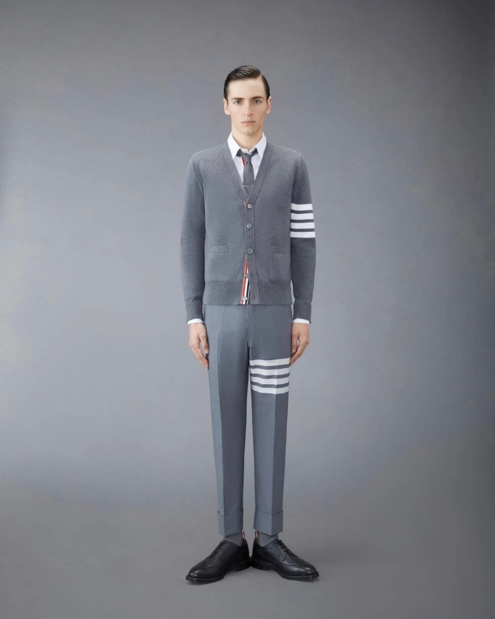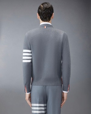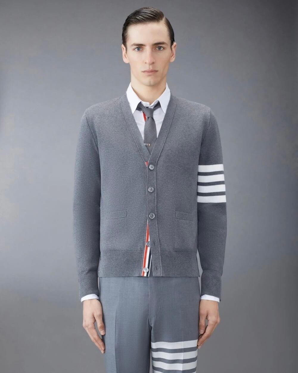 トム ブラウンのブランドアイコンであるグログラントリムと4BARストライプがあしらわれたコットンクレープ生地のVネックカーディガンです。