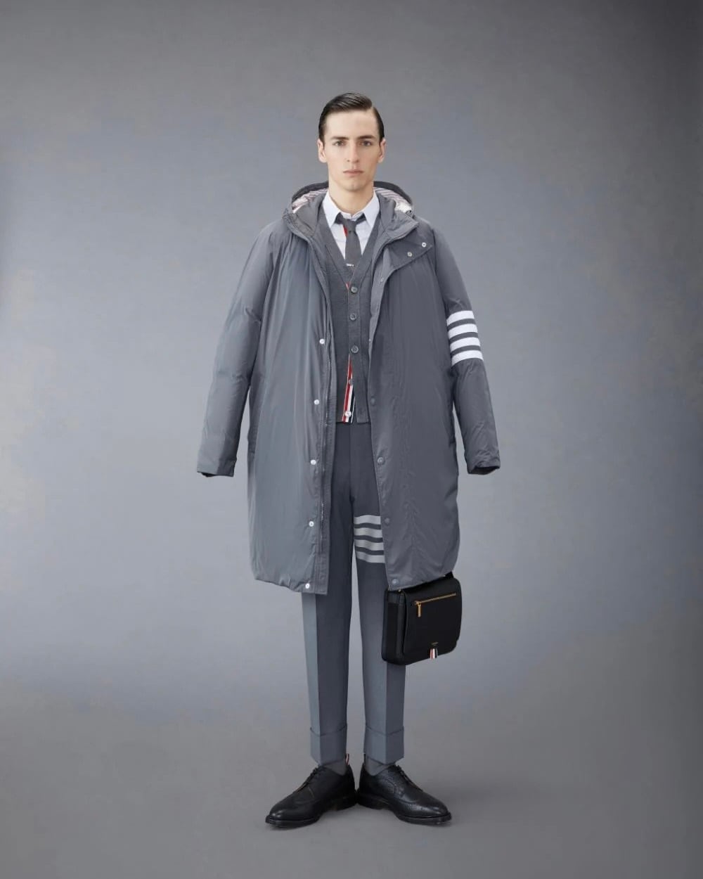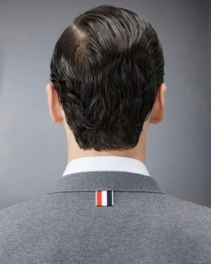 ボタン留めの両サイドのスリットと袖口に、シグネチャーストライプのグログランのトリミング