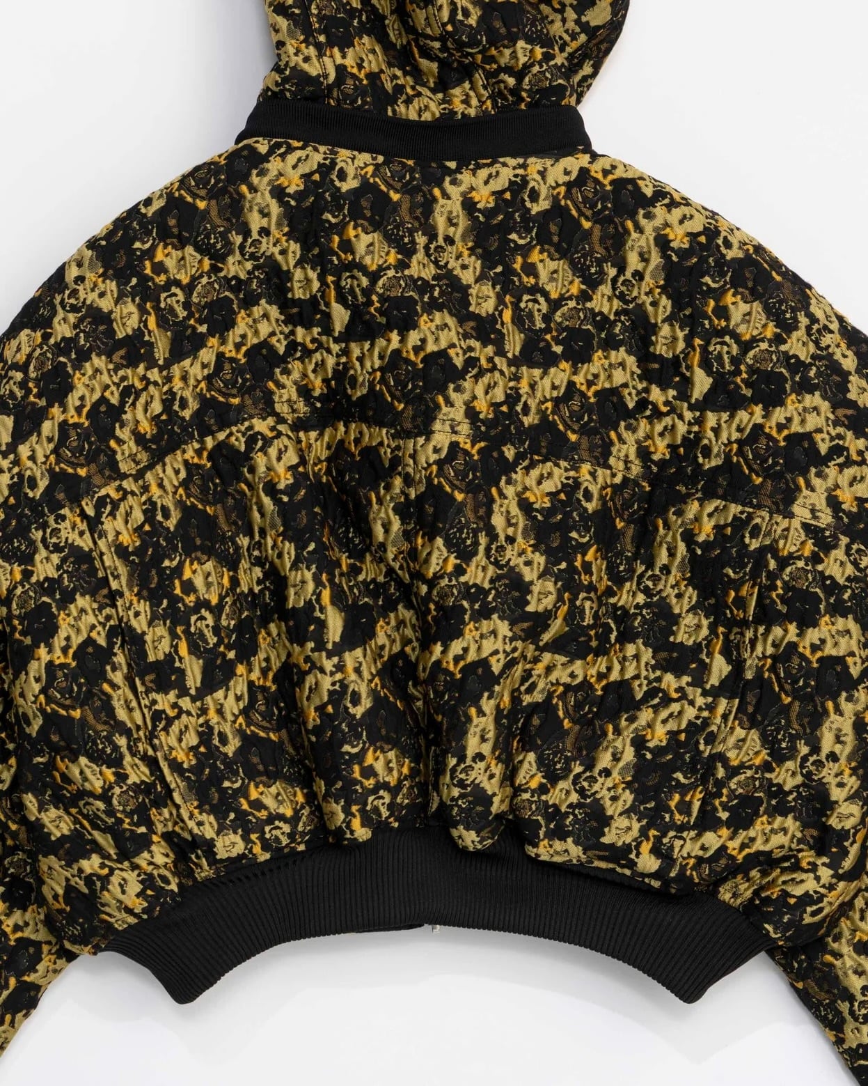 【YEL】目を引くアブストラクトなフラワーパターンがポイントのジャガード素材を使用。マットな質感でありつつも存在感のある柄で、ラグジュアリーな表情がポイント。