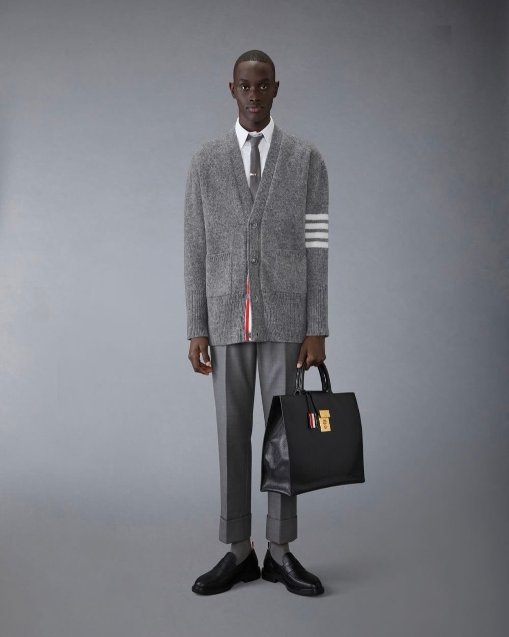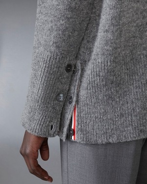 ボタン留めの両サイドのスリットに、シグネチャーであるストライプのグログランのトリミング