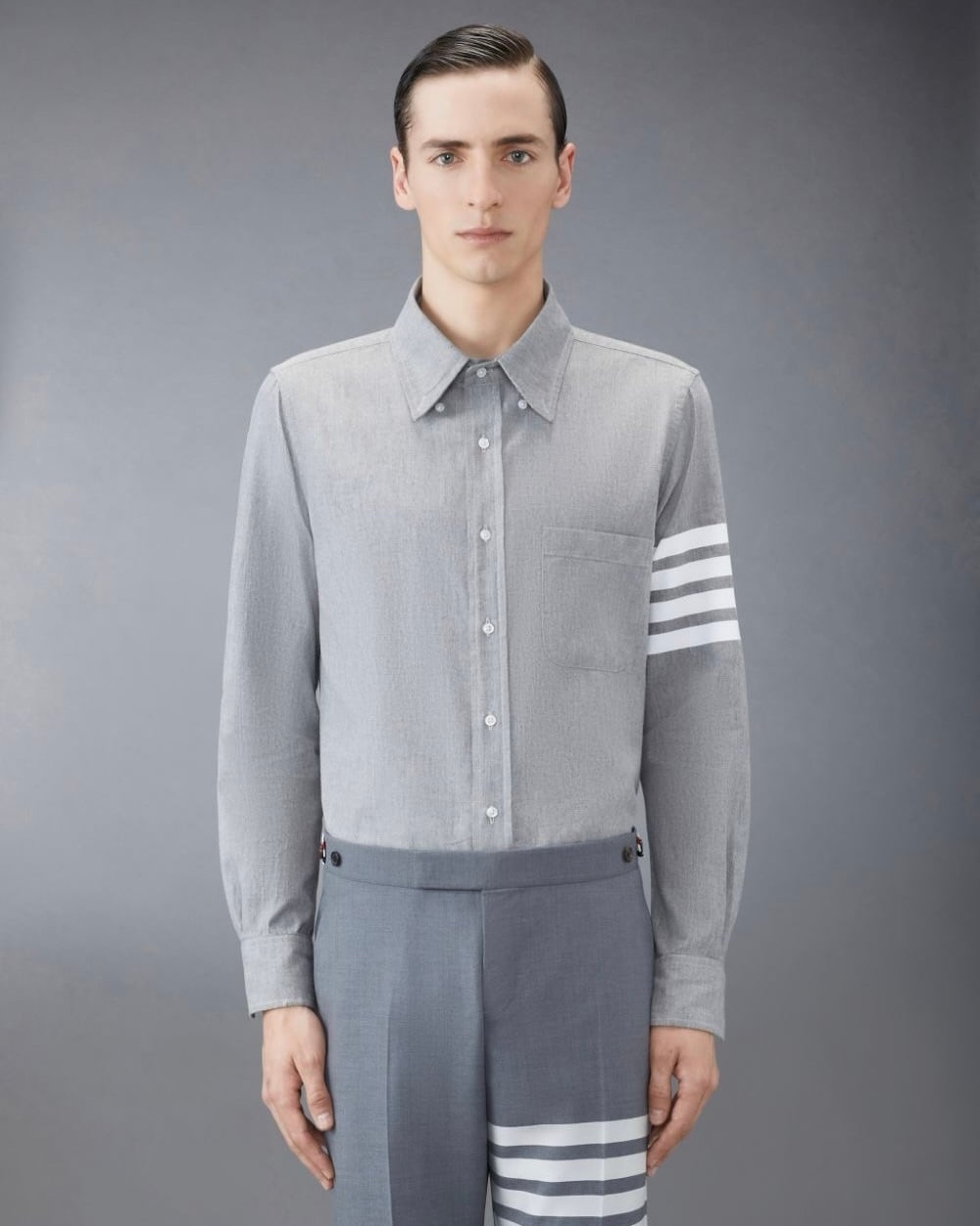 上質な職人技や細部まで行き届いたテーラリングが息づくトム ブラウンの定番、4BARストライプがあしらわれたシャンブレーのシャツです。